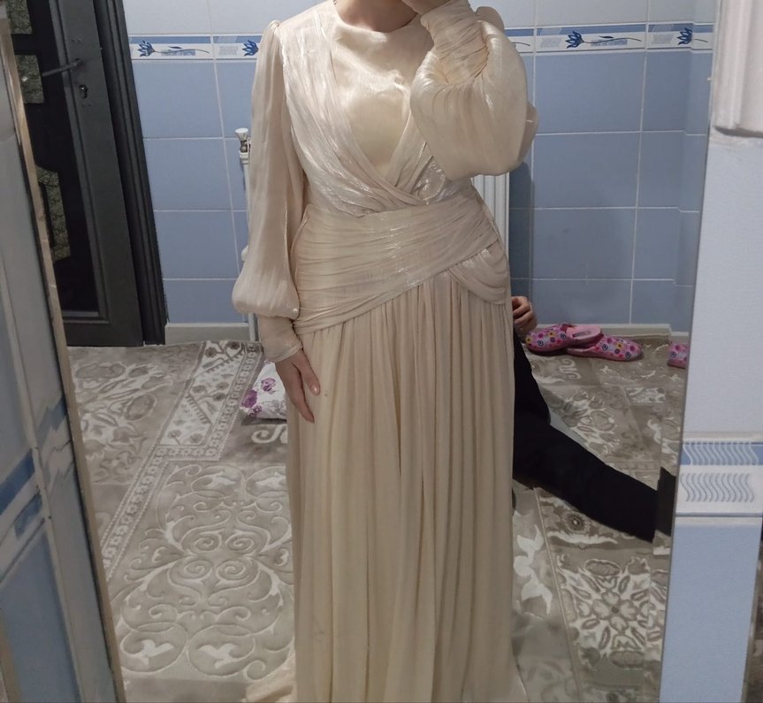 Bej renkli, uzun kollu ve drapeli tasarıma sahip, bol kesim kadın abiye elbise. düğün için uygundur.