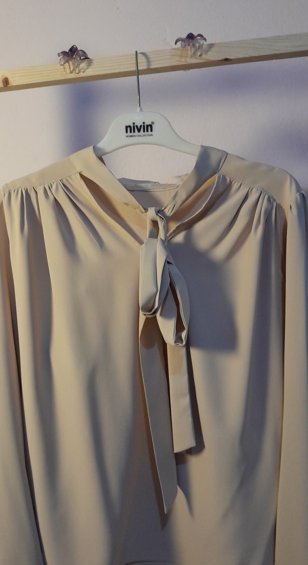 Bej renkte, drapeli tasarıma sahip, uzun kollu ve salaş kesim kadın bluz. İpek gibi dokusuyla midi boyda, ofis kullanımı için uygundur.