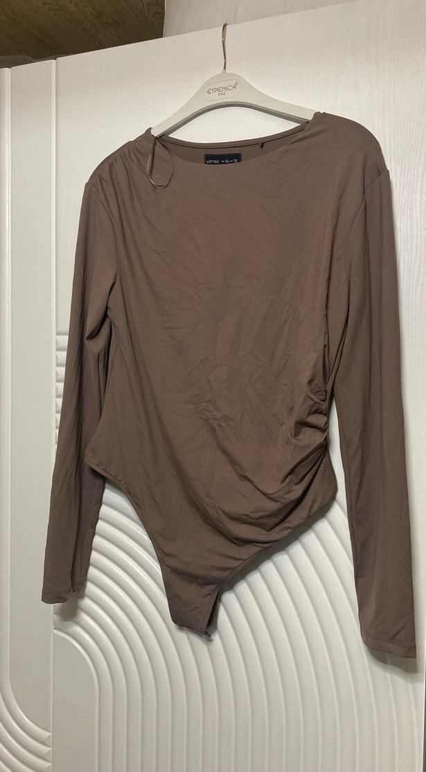 Bej renkte, uzun kollu ve yuvarlak yakalı keten kumaştan yapılmış, drapeli ve vücuda oturan kesime sahip minimalist tarzda kadın bluz. Günlük kullanıma uygundur.