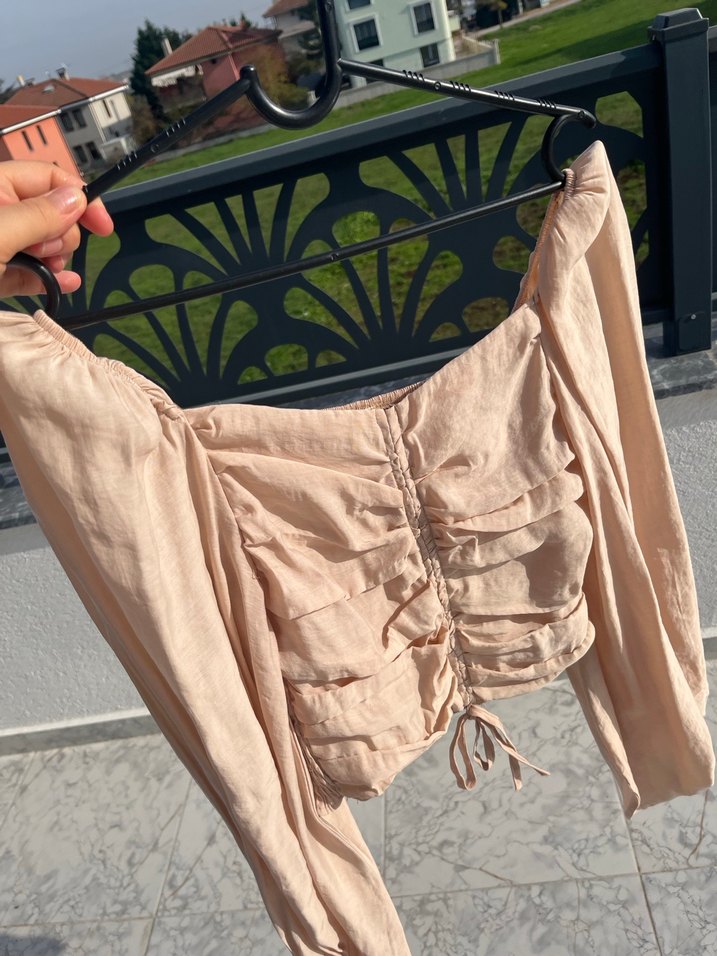 Bej keten kumaştan, straplez yakalı ve drapeli ön detaylı bluz. Uzun, vücuda oturan kollar ve kısa kesimle bohem tarzı yansıtıyor. Medium beden