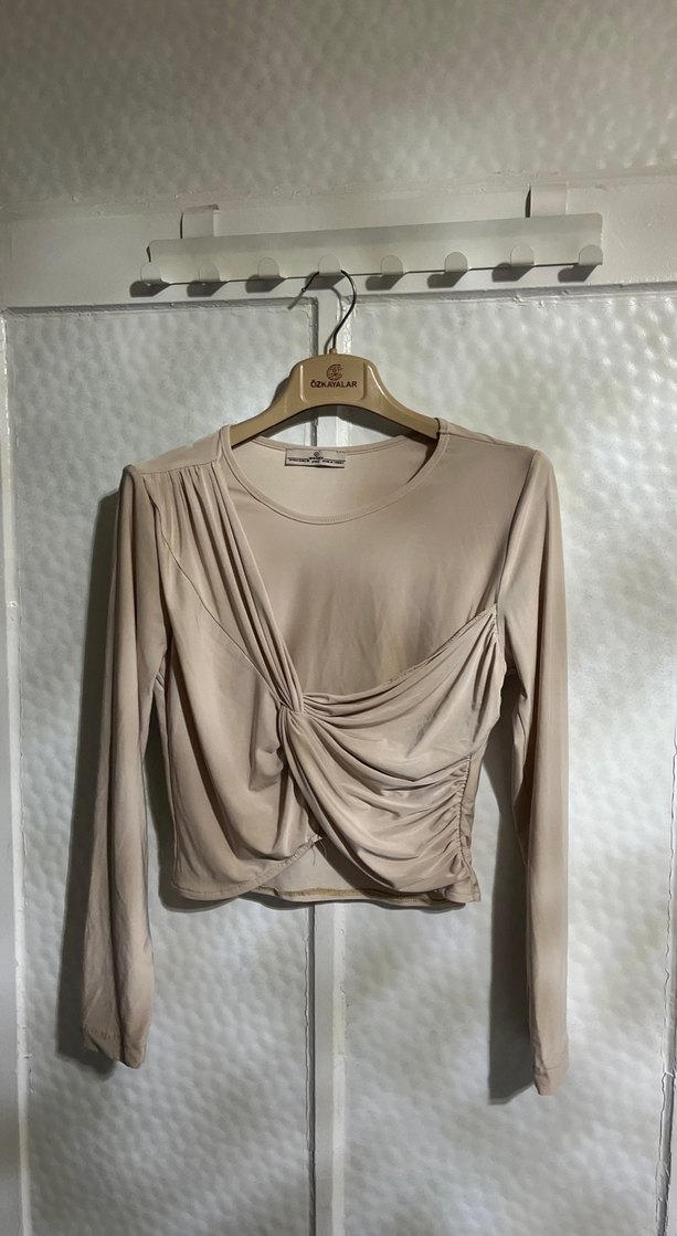 Bej Drapeli Uzun Kollu Kısa Kesim Bluz