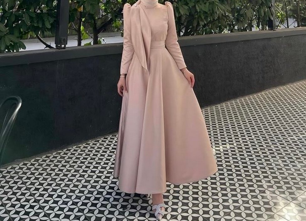 Bej renkte, uzun kollu ve kayık yaka detaylı, drapeli tasarıma sahip kadın elbisesi. İpek gibi dokusuyla klasik ve modern bir şıklık sunar, düğünler için uygun.