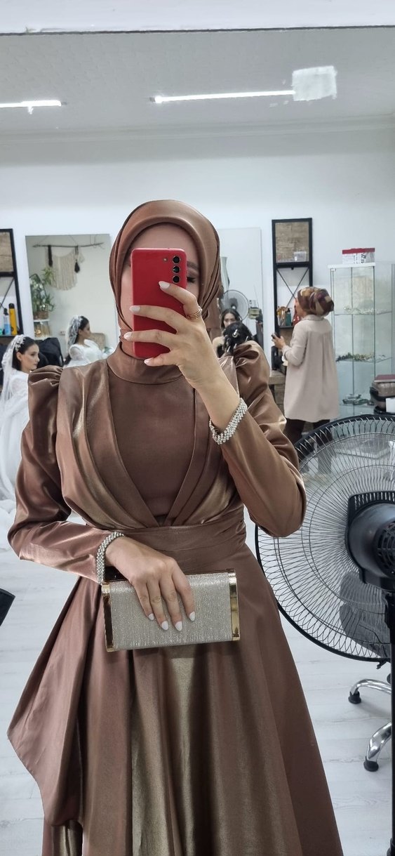 Bej Drapeli Uzun Kollu Tesettür Abiye