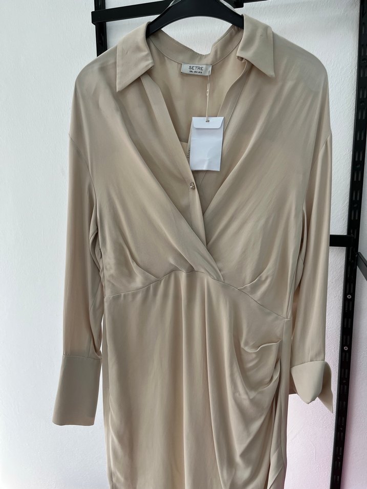 Bej renkte, drapeli tasarıma sahip, V yaka ve uzun kollu kadın elbisesi. Bol kesim ve uzun boy, çağdaş Paris tarzını yansıtıyor. Düz ve hafif kumaştan üretilmiştir.