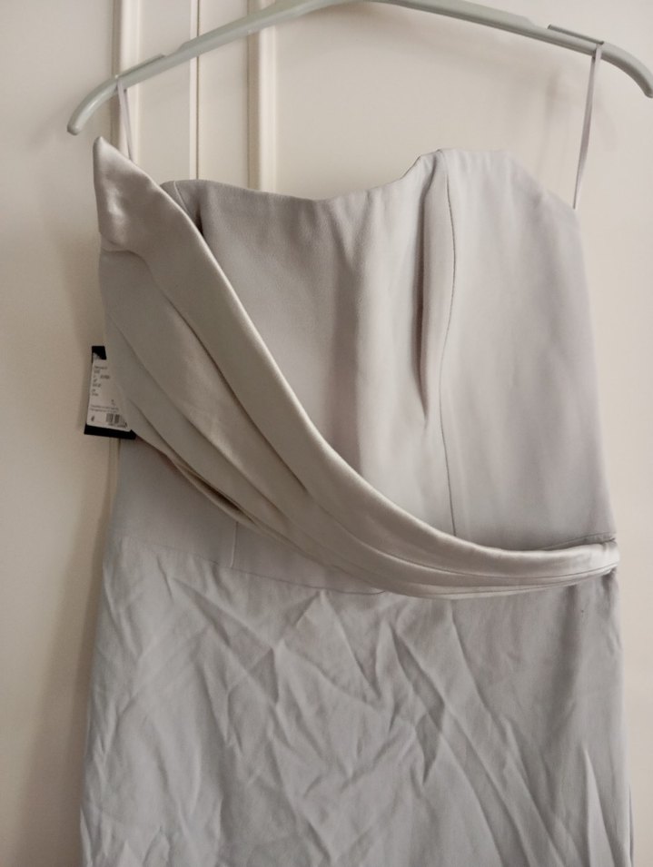 Beyaz drapeli, uzun ve straplez abiye elbise, ince kesimiyle modern ve minimal bir tarz sunar. Düğünler için uygundur. minik tamir edilebilir takılma defosu vardır