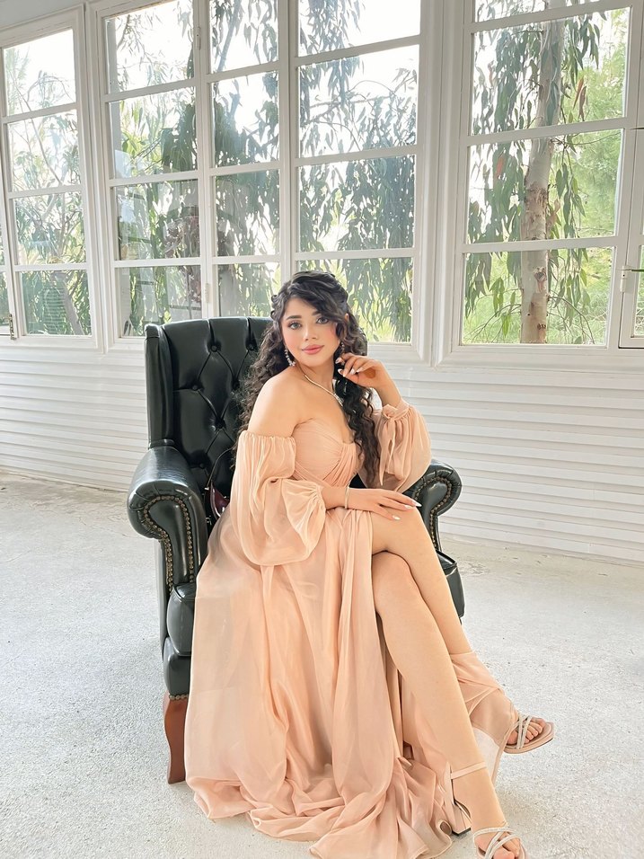 Bej renkte, drapeli uzun abiye elbise, straplez yaka ve bol kesimdedir. Kolsuz, bohem tarzıyla düğünler için uygundur.