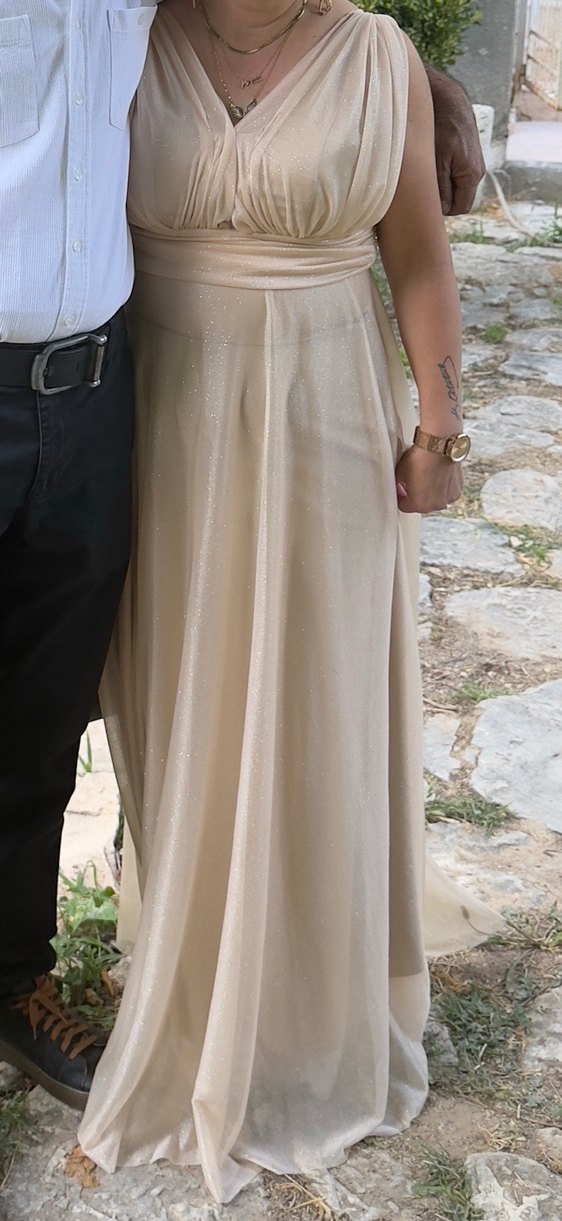 Bej renginde, straplez ve ince askılı, drapeli tasarıma sahip, klasik şıklık ve bohem Paris tarzını yansıtan uzun, vücuda oturan nişan elbisesi 1 kere giyildi simlidir
