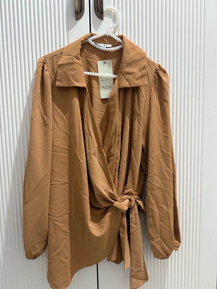 Bej renkte, uzun kollu, drapeli ve V yakalı kadın bluz. Yumuşak keten kumaştan, bol kesimle günlük sokak stiline uygun.
