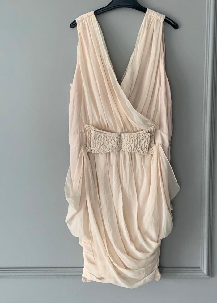 Kolsuz, bej renkli, V yakalı ve drapeli tasarıma sahip kısa abiye elbise. Salaş kesimi ve desensiz yapısıyla vintage bohem şıklığını yansıtıyor.