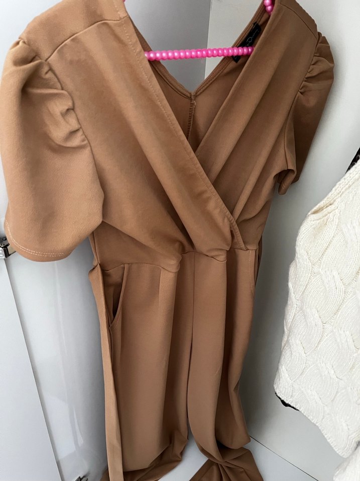 Bej renkte, drapeli V yakalı, satenimsi kumaştan, bol kesim, askılı kollu midi tulumu. Parlak dokusuyla minimal sokak modasına uygun, günlük kullanıma elverişlidir.