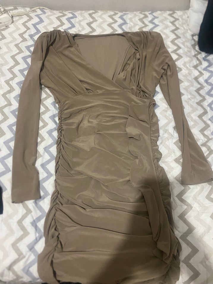 Bej renkli, uzun kollu ve drapeli tasarıma sahip, V yaka ve midi boyda oturan elbise. Şık ve rahat kumaşıyla öne çıkar.