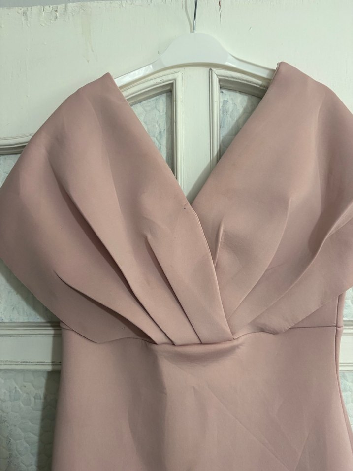 Bej renkte, drapeli V yakalı, kolsuz ve uzun kesim abiye elbise. İnce oturan modeli ve pastel tonu ile düğünler için uygundur.