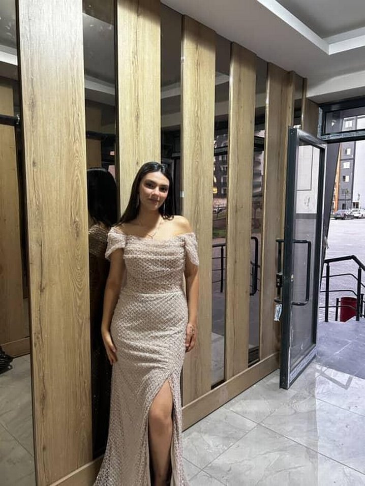 Bej renkli, yılan desenli uzun abiye elbise, drapeli ve tek omuz askılıdır. Klasik zarafeti yansıtan, düğünler için uygun şık bir modeldir.
