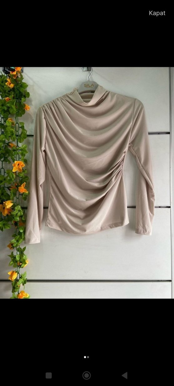 Bej renkte, yüksek yakalı ve uzun kollu kadın bluz. Drapeli detayları ve vücuda oturan midi kesimiyle minimalist ve şık bir tarz sunar.
