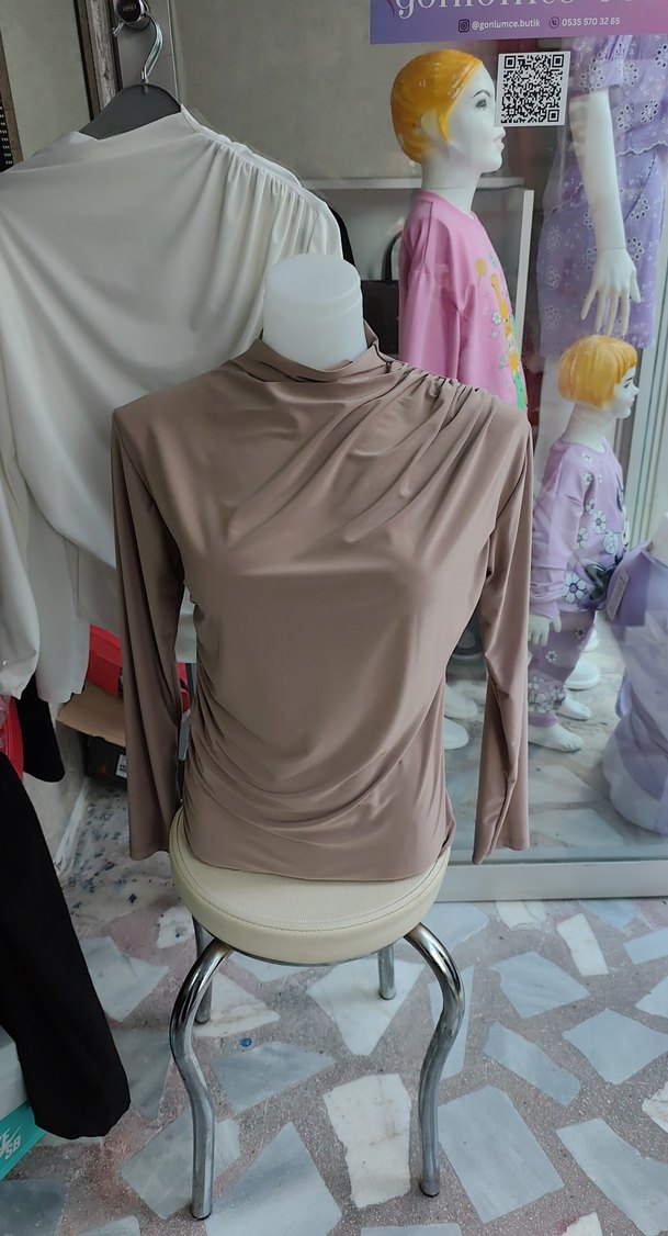 Bej Drapeli Yüksek Yakalı Kadın Bluz
