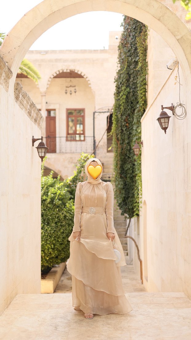 Bej renkte, yüksek yakalı ve drapeli katmanlara sahip, yumuşak sentetik kumaştan yapılmış uzun ve vücuda oturan elbise. İnce askılı ve sade tasarımıyla mütevazı ve bohem tarzlara uygundur.