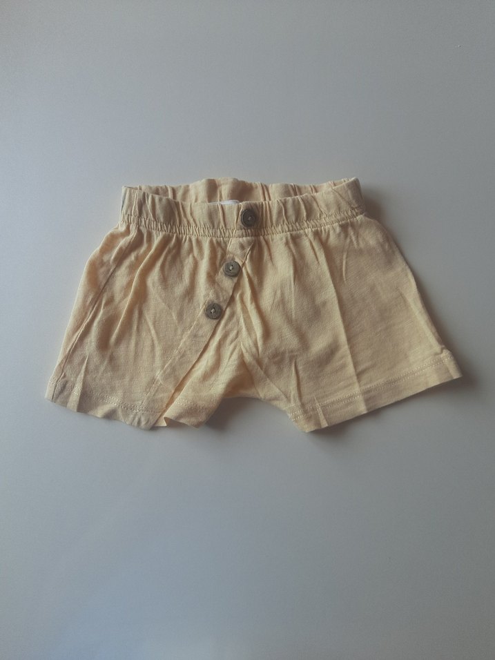 Yumuşak kumaştan yapılmış, düğmeli bej bebek iç çamaşırı. Rahat kullanım için uygundur. şort olarak kullandım