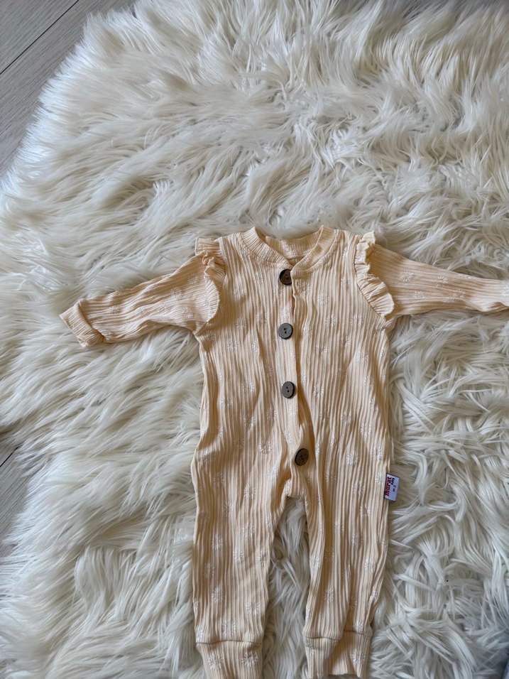 Bej renkli, düğmeli ve pastel tonlu bebek kız tulumu. Uzun kollu ve rahat kesimlidir.