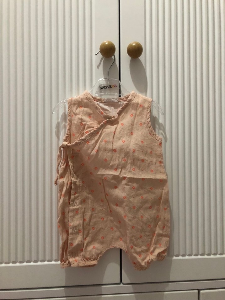 Pastel bej renkli, bağlamalı yan düğmeli bebek kız tulumu. Yumuşak ve rahat kumaştan üretilmiştir.