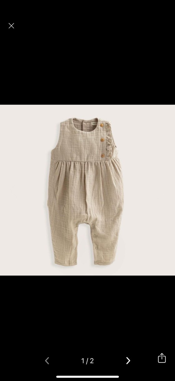 Bej pastel renkli, yan düğmeli bebek kız tulumu. Yumuşak ve rahat kumaştan, desensiz tasarıma sahip.