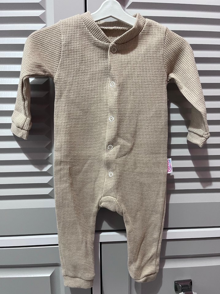 Bej renkte, düğmeli, uzun kollu ve yakası kesimli bebek tulumu. Yumuşak örme kumaştan üretilmiştir, konforludur.
