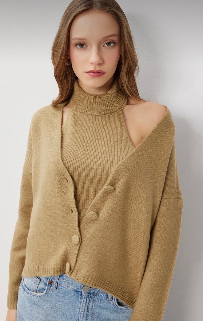 Bej Düğmeli Boğazlı Kısa Triko Kazak