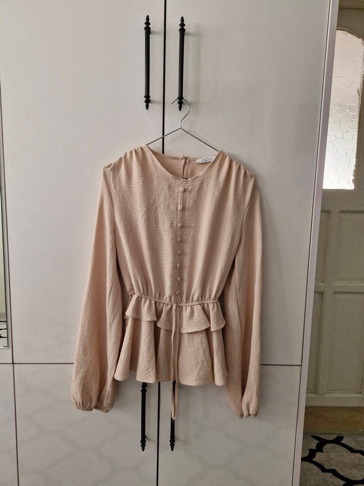 Bej keten bluz, uzun kollu, yuvarlak yaka ve düğmeli detaylara sahip. Salaş kesimi ve midi boyuyla bohem tarzında, rahat bir görünüme uygun. ikili takım sıfır ayarında hiç bir sıkıntısı yok s.m uyumlu