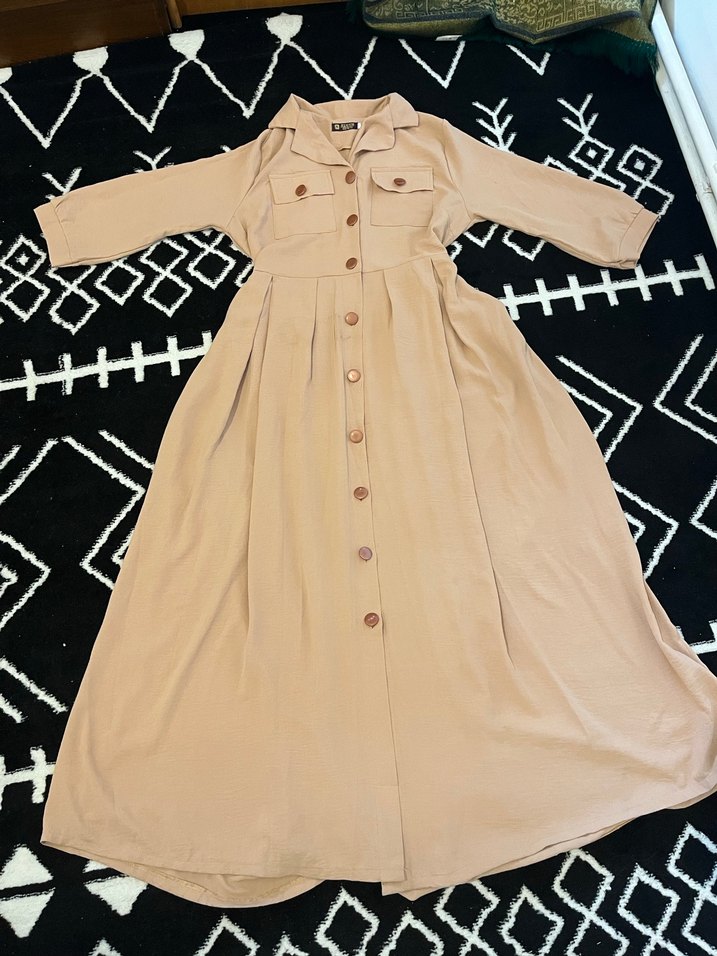 Bej renkli, düğmeli ön kısmı ve kesimli yakası ile uzun elbise. Uzun kollu, bol kesim ve yumuşak sentetik kumaştan, sade bohem tarzda günlük kullanıma uygun.