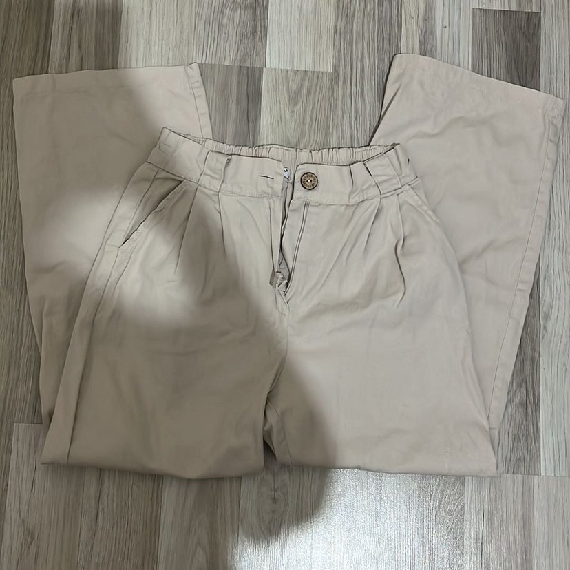 Bej renkli, düğmeli ve bol kesim keten pantolon.160 boyundayım boyu tam oluyor. Markası zara değil