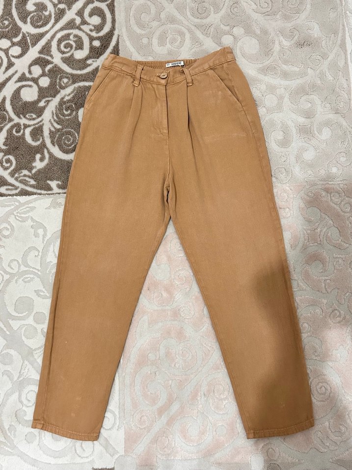 Düğmeli, bol kesim, pamuklu kumaştan yapılmış bej renkli, midi boy, sade ve pastel tonlarda kadın pantolon. Mom-havuç kalıp. Sadece bir kaç kez giydim ten rengime uymadığı için satıyorum