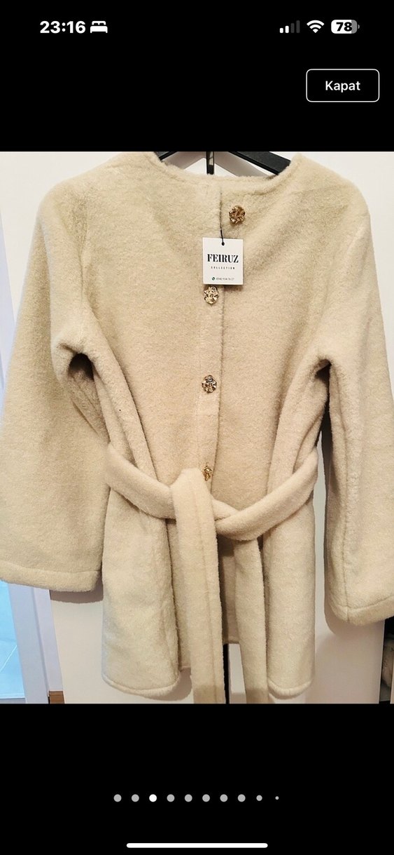 Bej renkte, yumuşak ve sıcak dokulu, düğmeli ceketi. Uzun kollu, kemerli ve mini boyda, salaş kesim. FEARUZ etiketi bulunur.