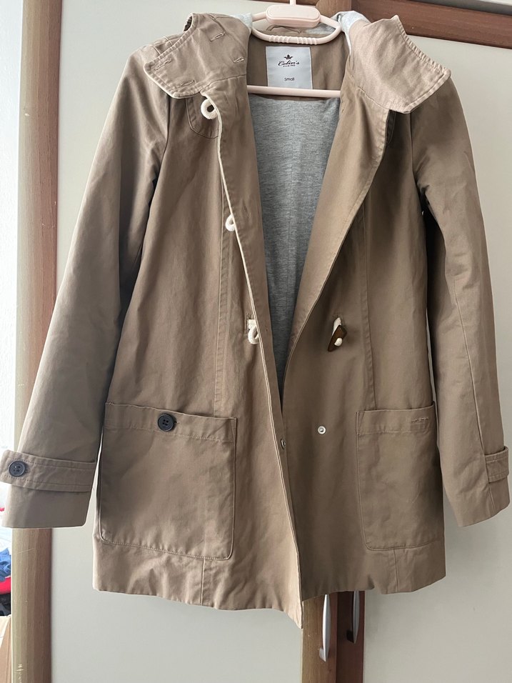 Bej, düğmeli ceket, pamuk kumaştan, uzun kollu ve midi boydadır. Salaş kesimi ve kesik yaka detayı ile gündelik kullanıma uygundur.