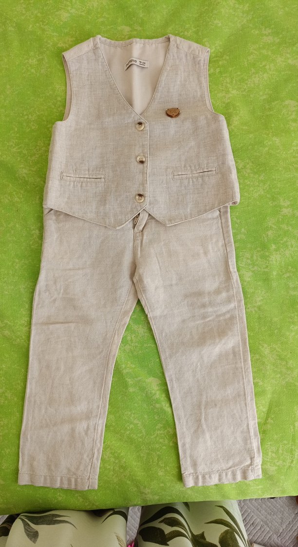 Bej renkli, düğmeli ve yakalı kolsuz yelek ile uyumlu pantolonlardan oluşan, regular fit çocuk takımı. Sade ve desensiz, trendi casual tarzda. pantolon 52 cm