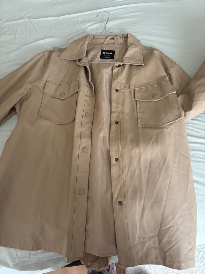 Bej renkli, parlak deri midi ceket. Düğmeli, notalı yaka ve uzun kollu, bol kesim modeliyle günlük rahat kullanıma uygundur. Sıfır ayarında 1-2 kere anca giyildi