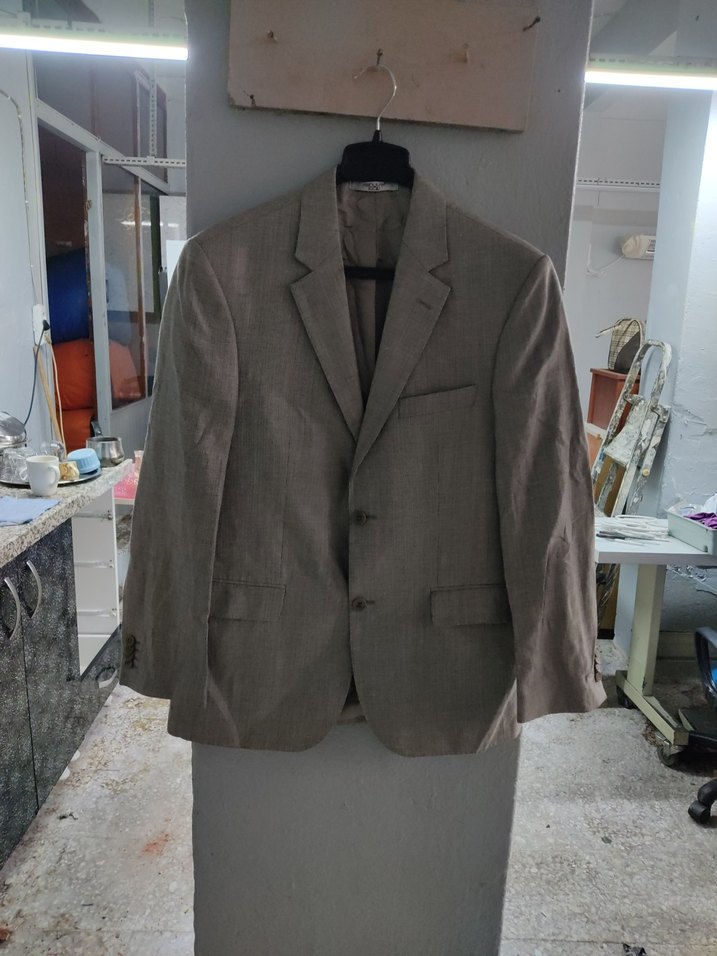 Bej renkli, düğmeli, uzun kollu erkek ceket. Normal kesim ve keskin yakalı, ofis ve sokak modasına uygun klasik şıklıkta.