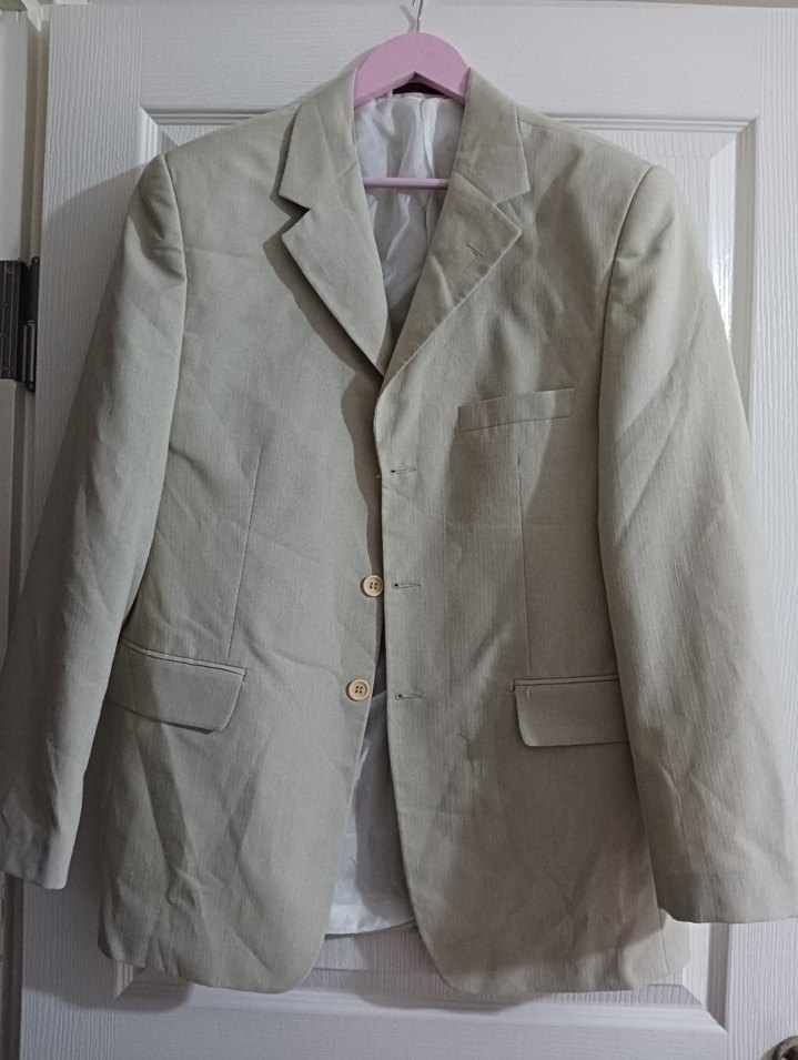 Bej renkli, düğmeli erkek ceket. Notch yaka, uzun kollu ve normal uzunlukta. Klasik şıklık ve iş ortamı için uygundur.