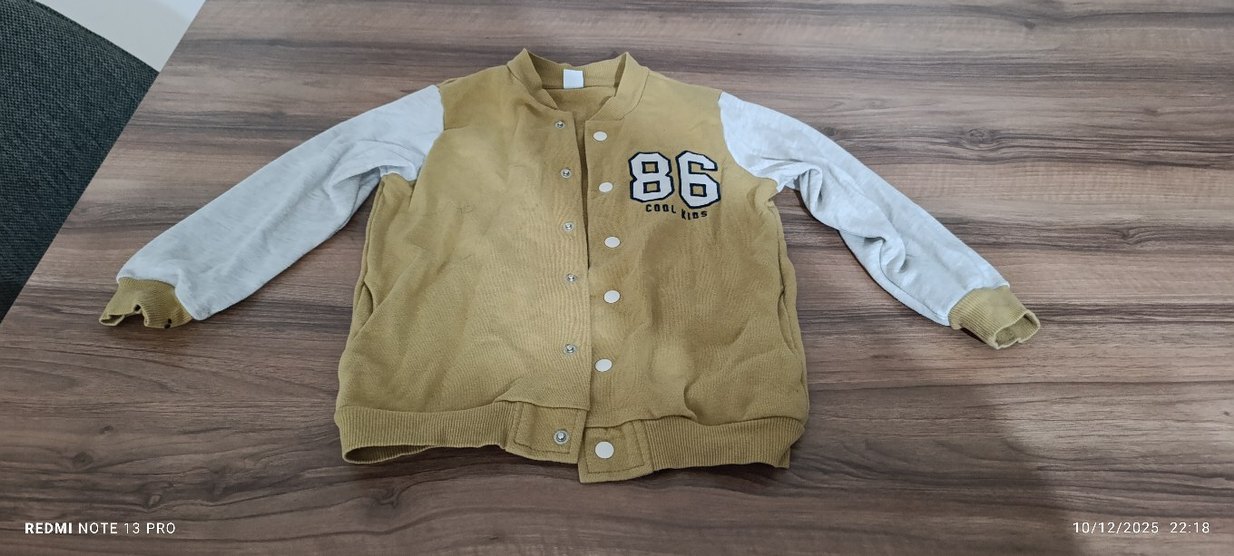 Bej renkli, düğmeli ve bol kesim erkek çocuk ceketi. Yumuşak ve sıcak kumaştan, baskılı açık renk kollar ve "86" detaylıdır.