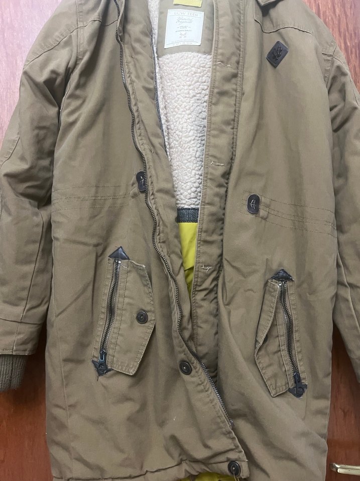 Bej renkli, düğmeli erkek çocuk kabanı, notched lapel yakaya sahiptir. Rahat kesim ve yumuşak, sıcak astar ile sokak stiline uygundur. Cepleri ve gri detayları bulunur.