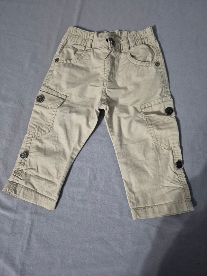 Bej pamuk erkek çocuk bol kesim kargo pantolon, düğme detaylı, rahat ve sokak stili için uygun.