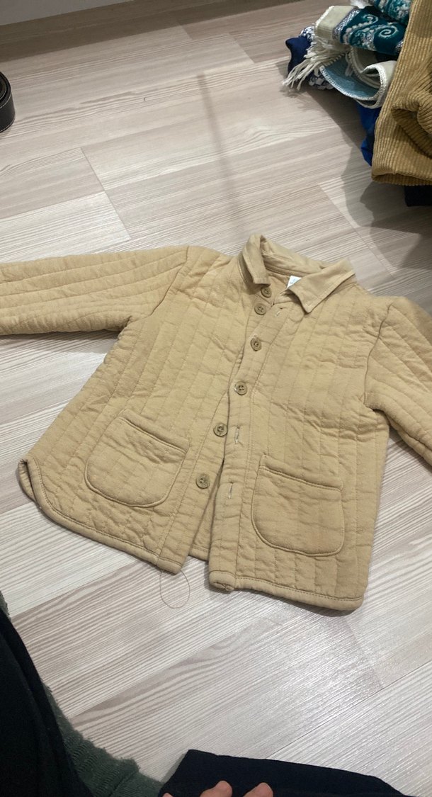 Bej keten kumaştan, düğmeli ve kesik yaka detaylı erkek çocuk ceketi. Rahat kesimi ve iki ön cepli, sokak stili için uygun.