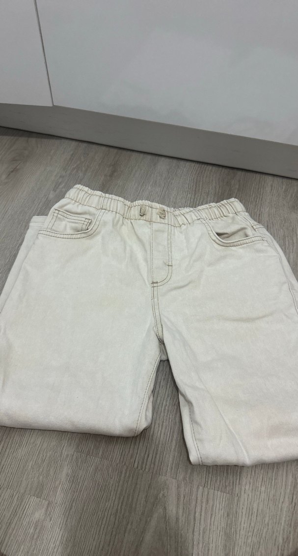 Yumuşak keten kumaştan, düğmeli kapamalı, bol kesim bej erkek çocuk pantolon. Rahat ve gündelik normcore tarzda tasarlanmıştır.