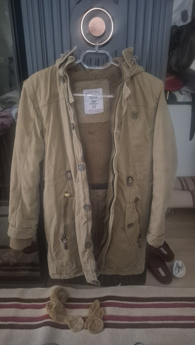 açık kahve renkli, düğmeli erkek çocuk parka. fermuar ve düğmeli kapüşonlu bilekleri lastik detaylı