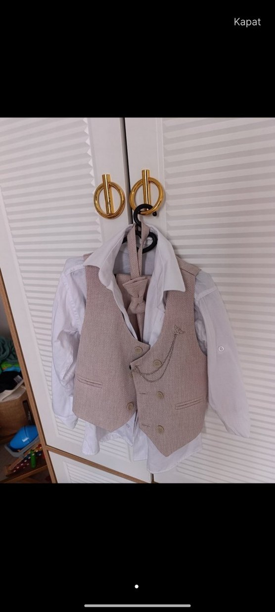 Bej renkli, düğmeli, kolsuz erkek çocuk yeleği. Modern klasik tarzda, normal kesim ve desensiz yapıda, şık bir görünüm sunar.