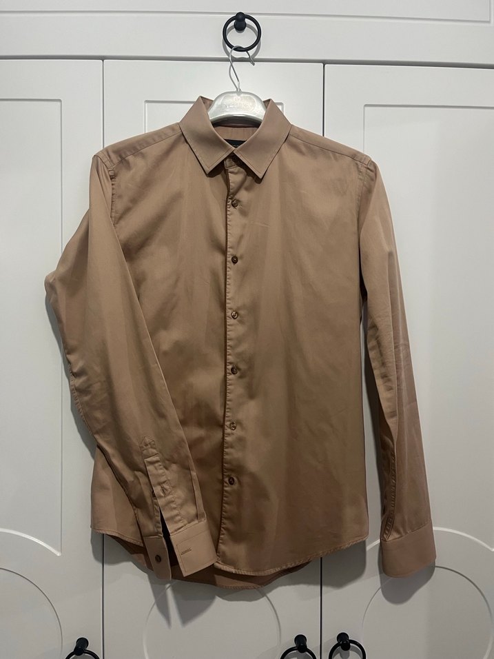 Bej renkli, düğmeli, uzun kollu erkek gömlek. Normal kesim ve parlak görünüme sahip, ofis ve günlük kullanım için uygun.