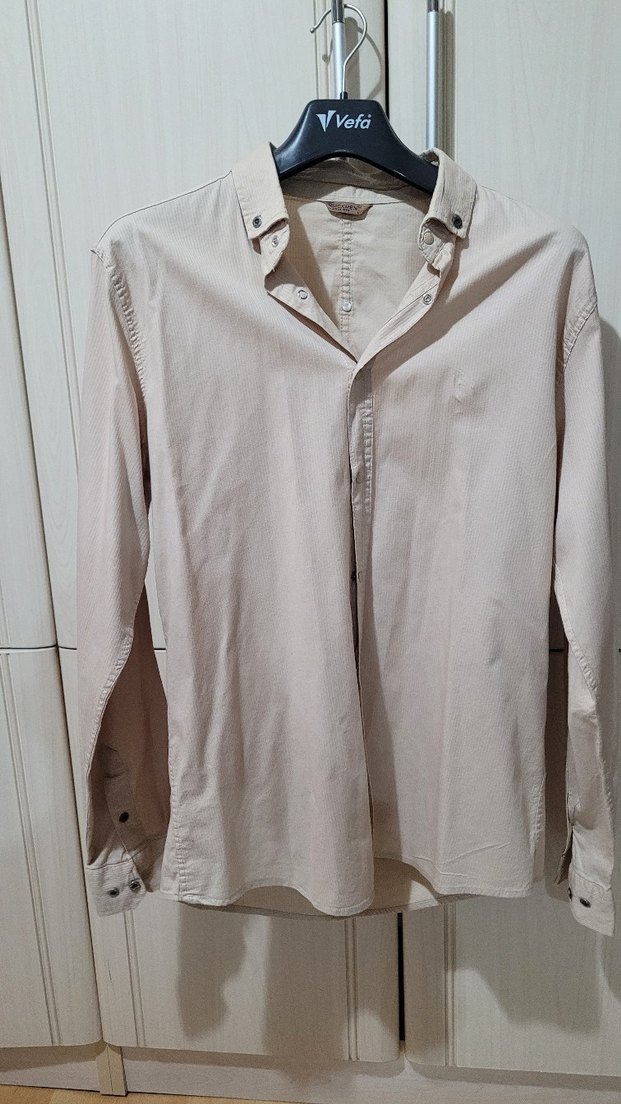 Bej renkli, keten kumaştan yapılmış, uzun kollu, düğmeli ve yakalı erkek gömleği. Rahat kesimiyle günlük sokak stiline uygundur.