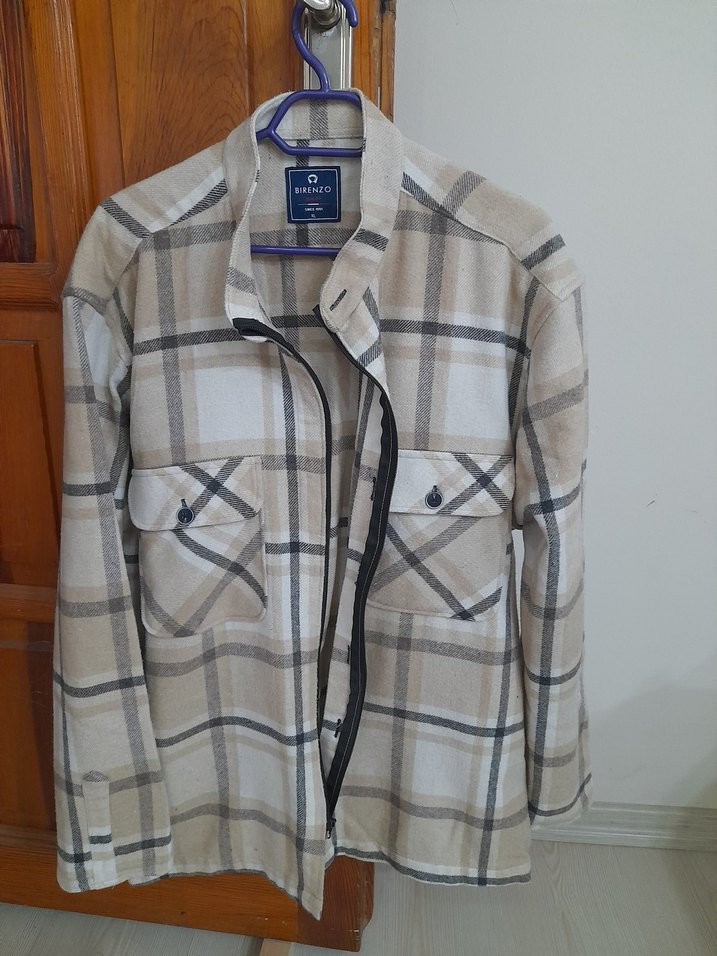 Düğmeli, uzun kollu ve kesik yakalı erkek gömleği. Bej ve gri kareli desene sahip, rahat kesim ve normal boyda. Yumuşak, sıcak kumaştan üretilmiştir.