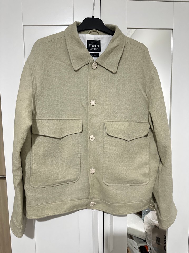 Bej keten kumaştan, düğmeli ve kesik yaka detaylı erkek ceket. Rahat kesimi ve uzun kollarıyla günlük sokak stili için uygundur.