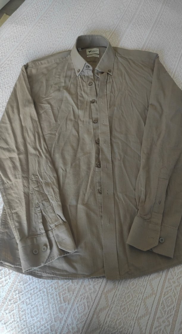 Bej keten erkek gömlek, uzun kollu ve düğmeli ön detaylı. Yaka tipi klasik ve bol kesim. Ofis ve günlük rahat kullanım için uygundur.