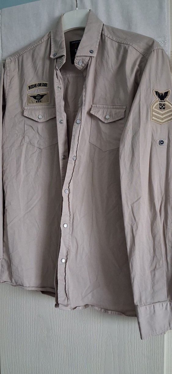 Bej renkli keten erkek gömlek, düğmeli ve uzun kolludur. Notched lapel yakaya sahip, bol kesim ve günlük rahat stil için uygundur. Göğüs cepleri ve kol detaylarında yamalar bulunur.