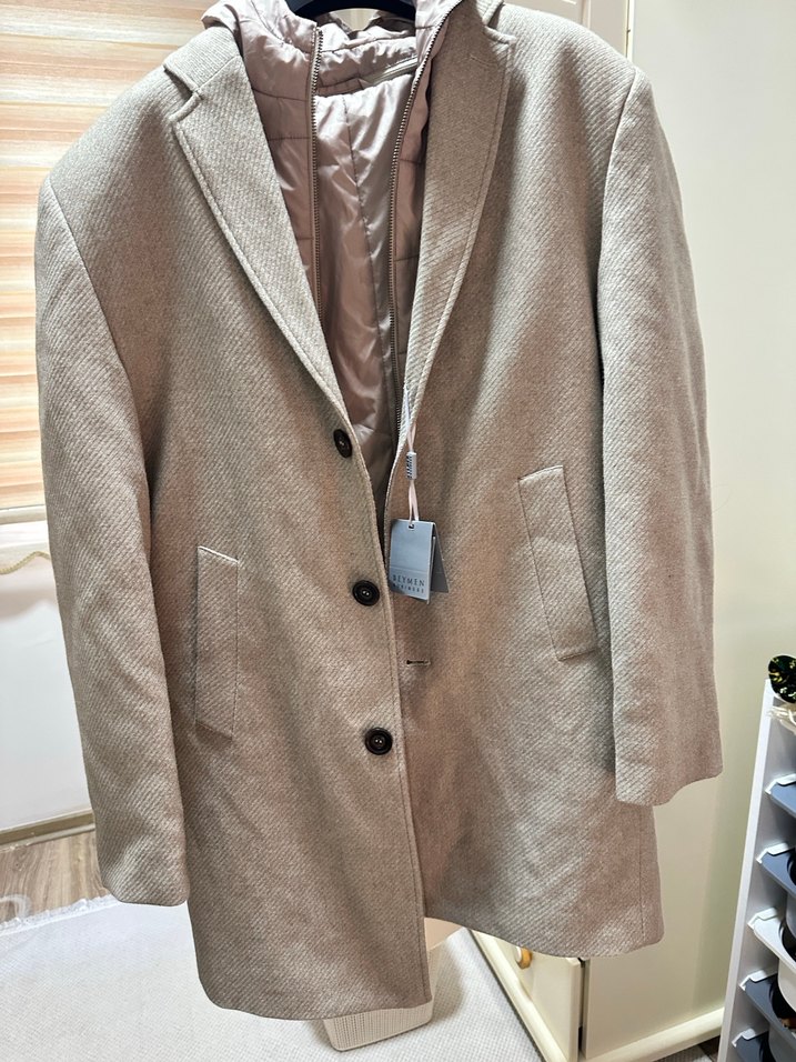 Bej renkli, düğmeli erkek midi kaban, notched lapel yakalı ve uzun kolludur. Rahat kalıp ve yumuşak sentetik kumaştan üretilmiştir. İş ve günlük kullanım için uygundur.